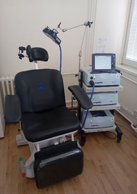 У лабораторији за Транскранијалну магнетну стимулацију примењује се ТМС у лечењу одраслих пацијената са психијатријским болестима уз помоћ апарата Rapid Therapy System (Magstim), који је Институт добио као донацију од Амбасаде Јапана у Републици Србији (Уговор о донацији, број 48/2023. од 28.11.2023. године).